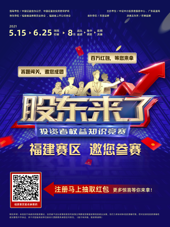 为引导广大中小投资者掌握投资知识,提升风险意识,提高自我保护能力,培育成熟理性的投资者队伍和投资文化,在中国证监会办公厅、投资者保护局指导下,中证中小投资者服务中心(简称投服中心)于2021年5月至9月举办《股东来了》2021投资者权益知识竞赛(简称《股东来了》2021)。