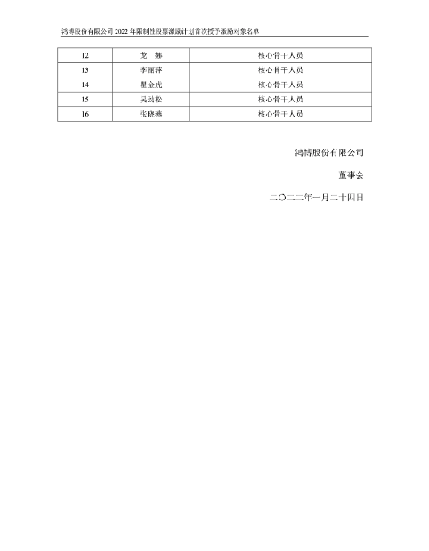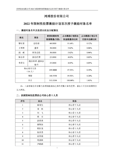 珠海寰博科技2022年限制性股票激励计划首次授予激励对象名单